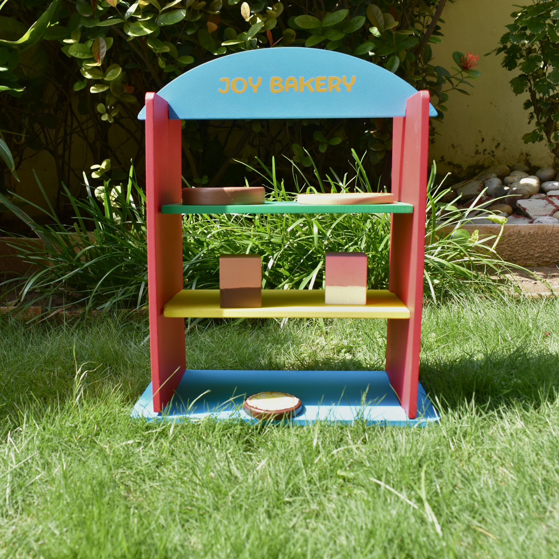 Set up the cupcakes, pizza slices, and treats on the stand to create a pretend shop.